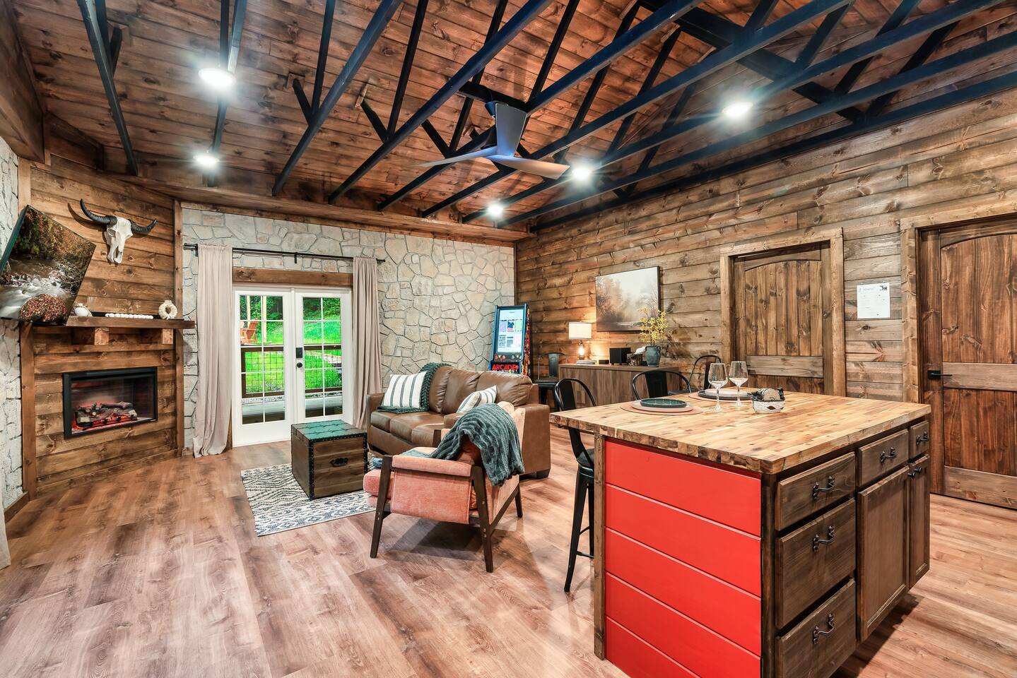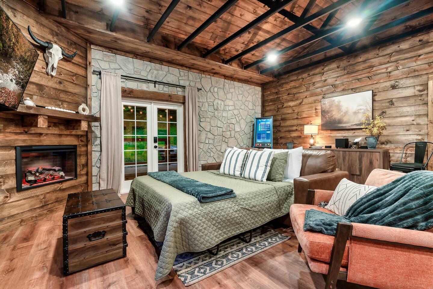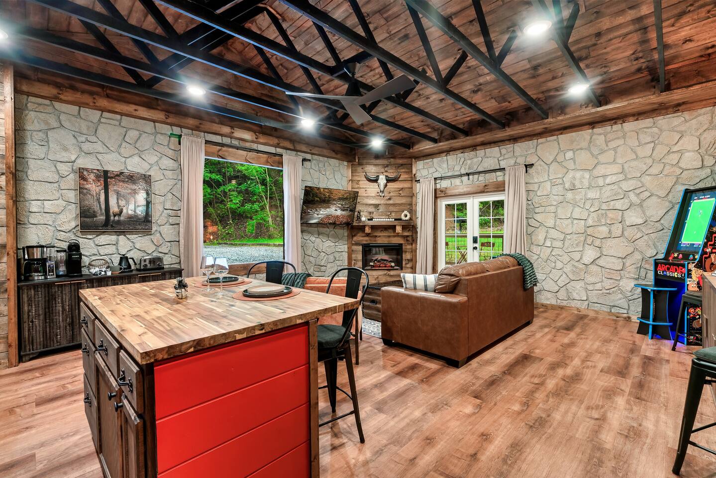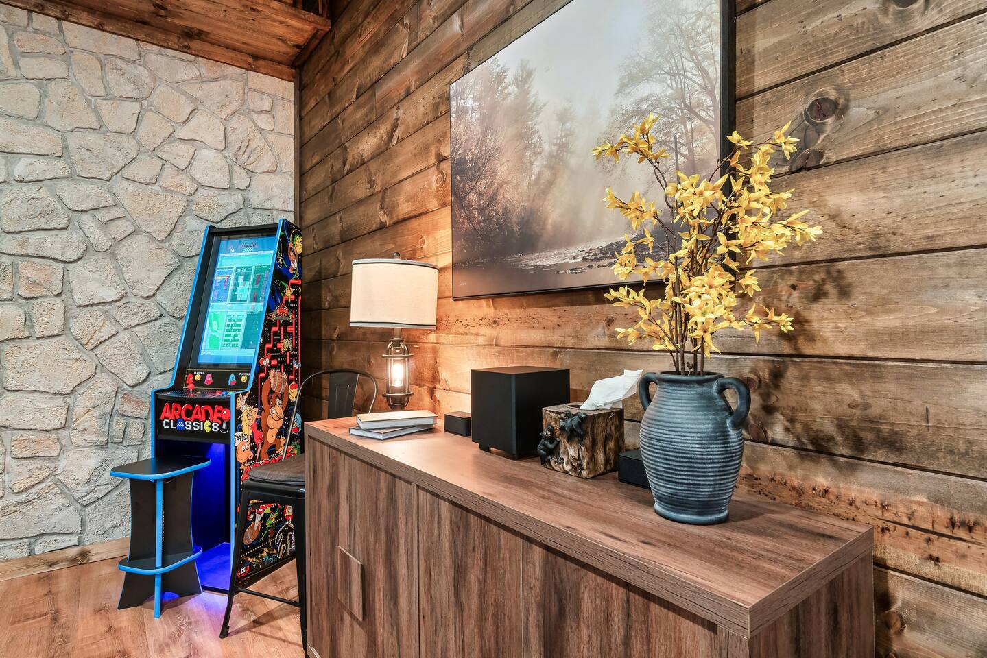 🏠🌲 Welcome to Stone Hollow! 🌲🏠 Our cozy cabin is perfect for a romantic getaway, a small family vacation, or a fun trip with friends. Just a short drive from Dollywood, this charming retreat offers the perfect blend of adventure and relaxation. Unwind in the hot tub after a day of exploring, challenge each other in the arcade, or gather around the fire pit under the stars. With a king-size bed and queen pull-out, our one-bedroom cabin provides a comfortable and memorable stay. ➡️ ENTERTAINMENT 🏊 Private 2 Lounger Hot Tub 🔥 Outdoor Fire Pit (BYO Firewood) ♨️ Park-Style Grill (BYO Charcoal) 🕹️ Multicade 🎲 Board Games 📺 Smart TVs 📶 High-speed Wi-Fi (600 Mbps) ➡️ LIVING ROOM 🛏️ 1 Queen Pull Out Couch 🔥 Electric Fireplace 📺 55" Smart Roku TV ❄️ Brand new AC/heater split unit 🍼 Pack 'n Play ➡️ BEDROOM 🛏️ King Bed 💼 Desk 📺 50" Smart Roku TV 👕 Garment Rack with hangers 🧳 Luggage Rack ♨️ Space Heater ➡️ KITCHEN 👨🍳 Fully equipped with pots, pans, dishware, and cooking utensils ☕ Coffee Station ✨ Keurig Coffee Machine ✨ Drip Coffee Machine ✨ Pour Over ✨ Italian Coffee Machine ✨ We do provide a starter kit of K-Cups, Instant Coffee, Ground Coffee, and Sugar. ➡️ BATHROOM 🛁 Shower/Tub combo 🧺 Washer/Dryer 🥌 Iron & Iron board ✨ Hair Dryer ✨ Essentials
