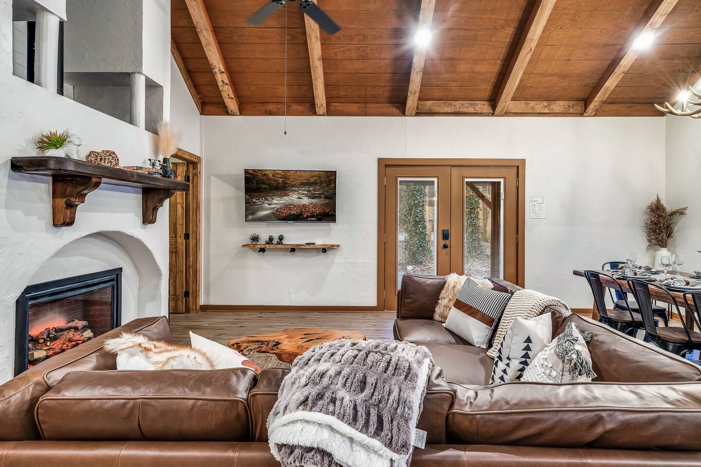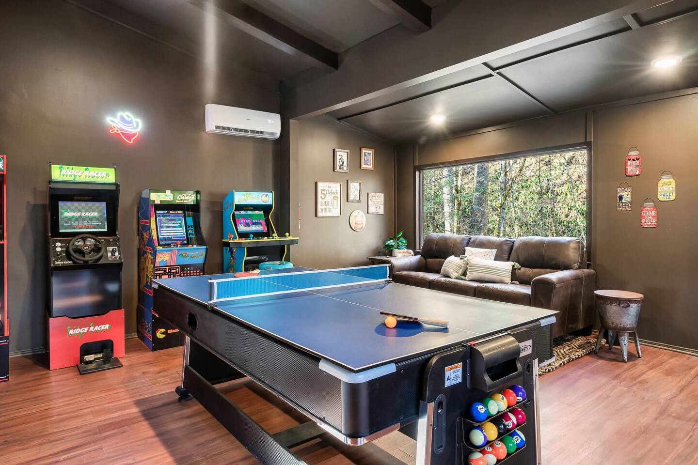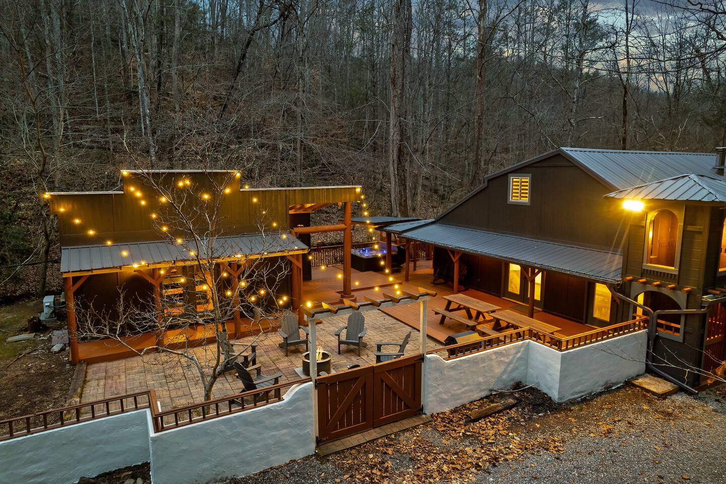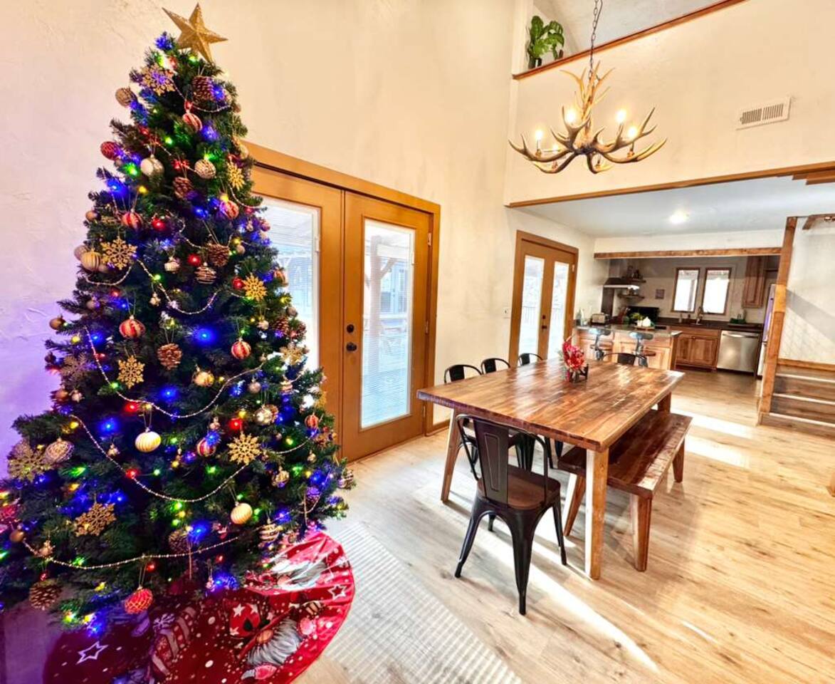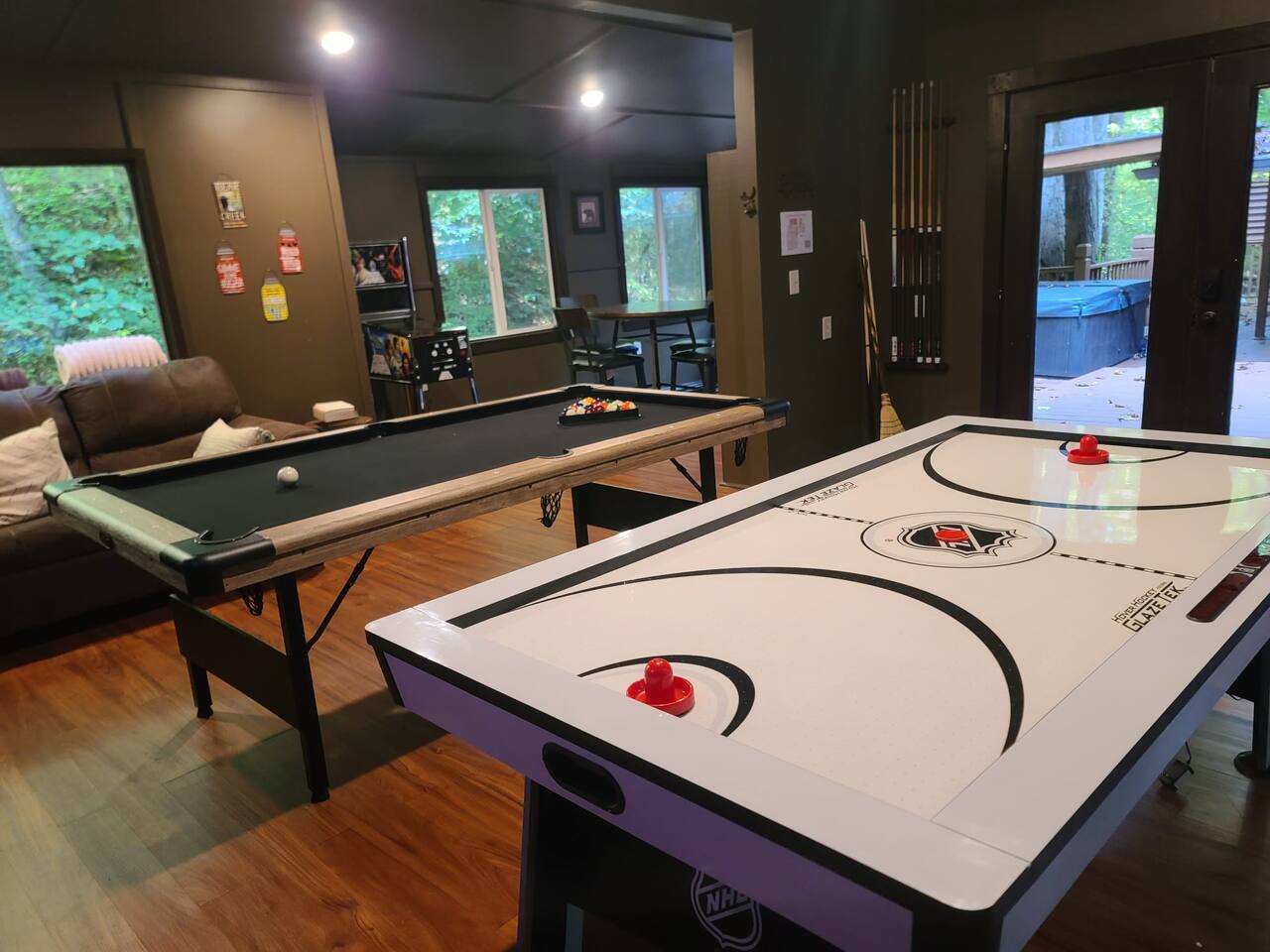 🍁 Welcome to Maple Creek Lodge! 🍁 Maple Creek Lodge is a private, updated cabin with plenty of amenities for the whole family to enjoy. The land also features a serene and peaceful private section of a natural creek flowing year-round. Although there is a neighbor on the right side of the property, their house faces the back of the cabin. Your privacy won't be compromised. ➡️ ENTERTAINMENT 🏊 Private 6 Seater Hot Tub with Lounger in Covered Area 🔥 Outdoor Fire Pit (BYO Firewood) ♨️ Park-Style Grill (BYO Charcoal) 🛝 Swing Set 🕹️ 6 Arcade Machines 🎲 Board Games 🎱 Pool Table 🏒 2-in-1 Air Hockey Table / 🏓 Ping Pong 📺 Smart TVs 📶 High-speed Fiber Wi-Fi (1 Gig) ➡️ LIVING AREA 📺 55" Smart Roku TV 🔥 Electric Fireplace 🛋️ Comfortable Leather Couch 🍼 Pack 'n Play & High chair ✨ Open Space to Kitchen and Dining Areas 🍽️ Dining area seats 8 at the table and 2 at the breakfast bar. ➡️ KITCHEN 👨🍳 Fully equipped with pots, pans, dishware, and cooking utensils ☕ Coffee Station ✨ Keurig Coffee Machine ✨ Drip Coffee Machine ✨ Pour Over ✨ Italian Coffee Machine ✨ We do provide a starter kit of K-Cups, Instant Coffee, Ground Coffee, and Sugar. 🧺 Washer/Dryer in Laundry Room 🥌 Iron & Iron board ➡️ BEDROOM 1 (Master Bedroom) 🛏️ Queen Bed 💼 Desk 👕 Closet with hangers 🧳 Luggage Rack ♨️ Space Heater 🛁 Full Bath ➡️ BEDROOM 2 🛏️ Queen over Queen Bunk Bed 💼 Desk 👕 Closet with hangers 🧳 Luggage Rack ♨️ Space Heater ➡️ BEDROOM 3 (Upstairs) 🛏️ Queen Bed 💼 Desk 👕 Closet with hangers 🧳 Luggage Rack ♨️ Space Heater ➡️ Loft 🛏️ Twin pull out bed (Becomes a Double Twin) ➡️ BATHROOMS 🛁 Large guest bathroom with large tub and stand-alone shower 🛁 Shower/Tub combo in Master Bathroom ✨ Hair Dryer ✨ Essentials